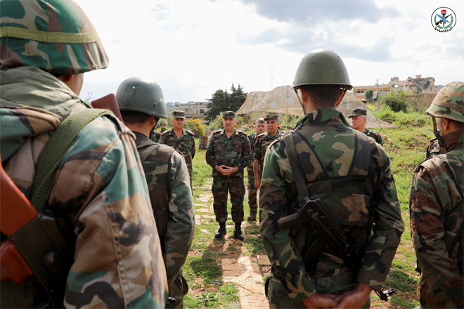 El alto militar sirio se reunió con los líderes de las formaciones y comandantes de campo y trasladó a los soldados las felicitaciones del presidente al-Assad con motivo de Eid Al-Fitr, y sus deseos de bienestar a ellos y sus familias.
