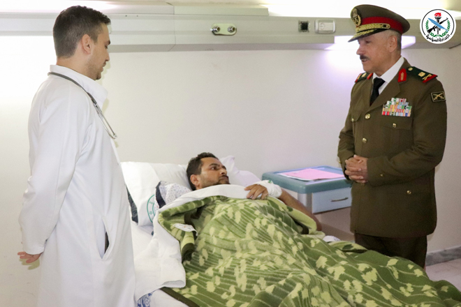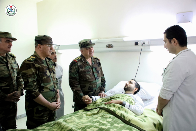 Al final de su gira, Abbas preguntó por la salud de los soldados ingresados en el Hospital Militar de Tishreen y los felicitó por la fiesta actual deseándoles a ellos y a sus familias salud y bienestar.