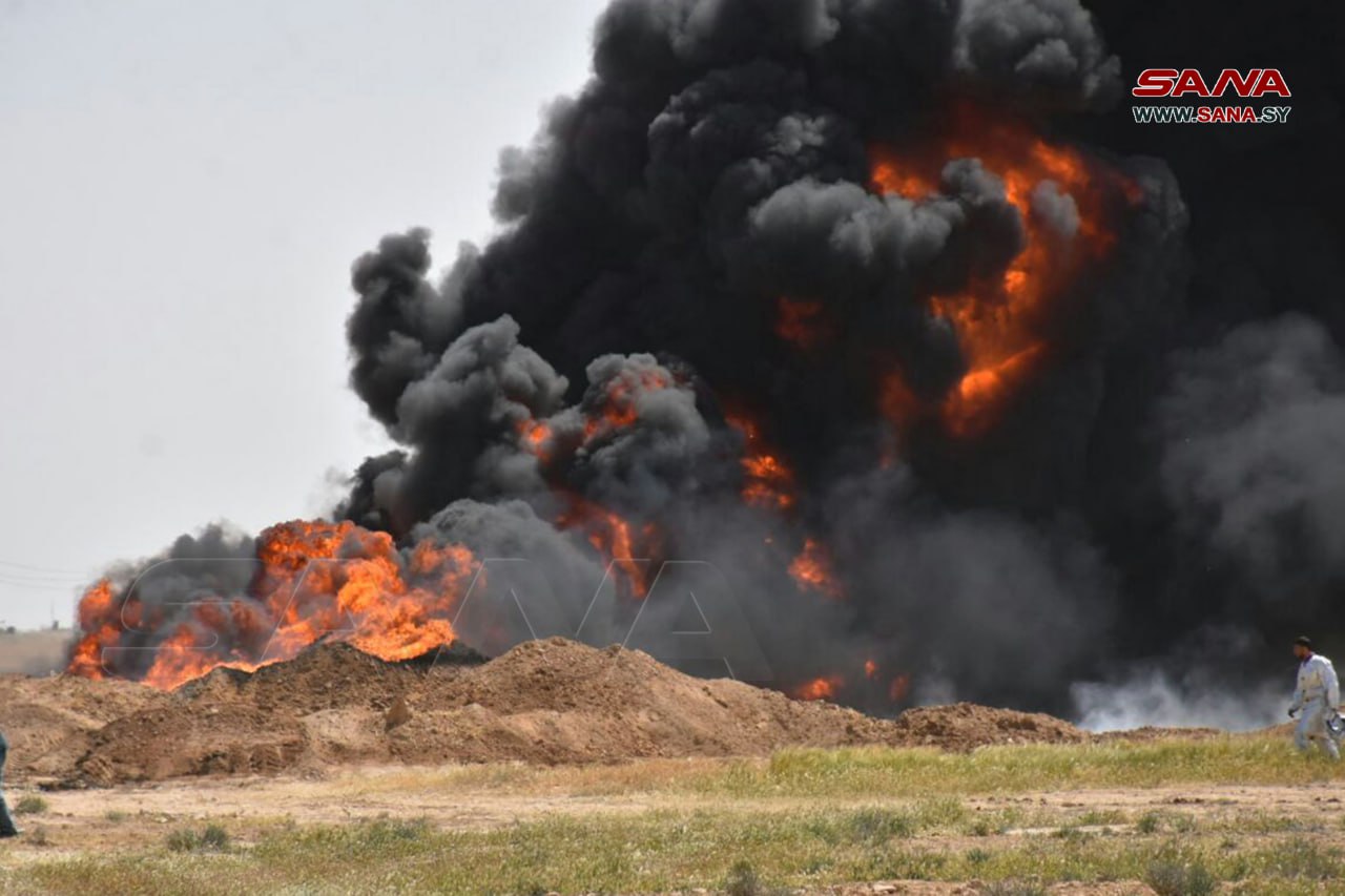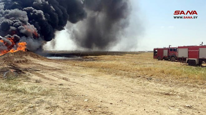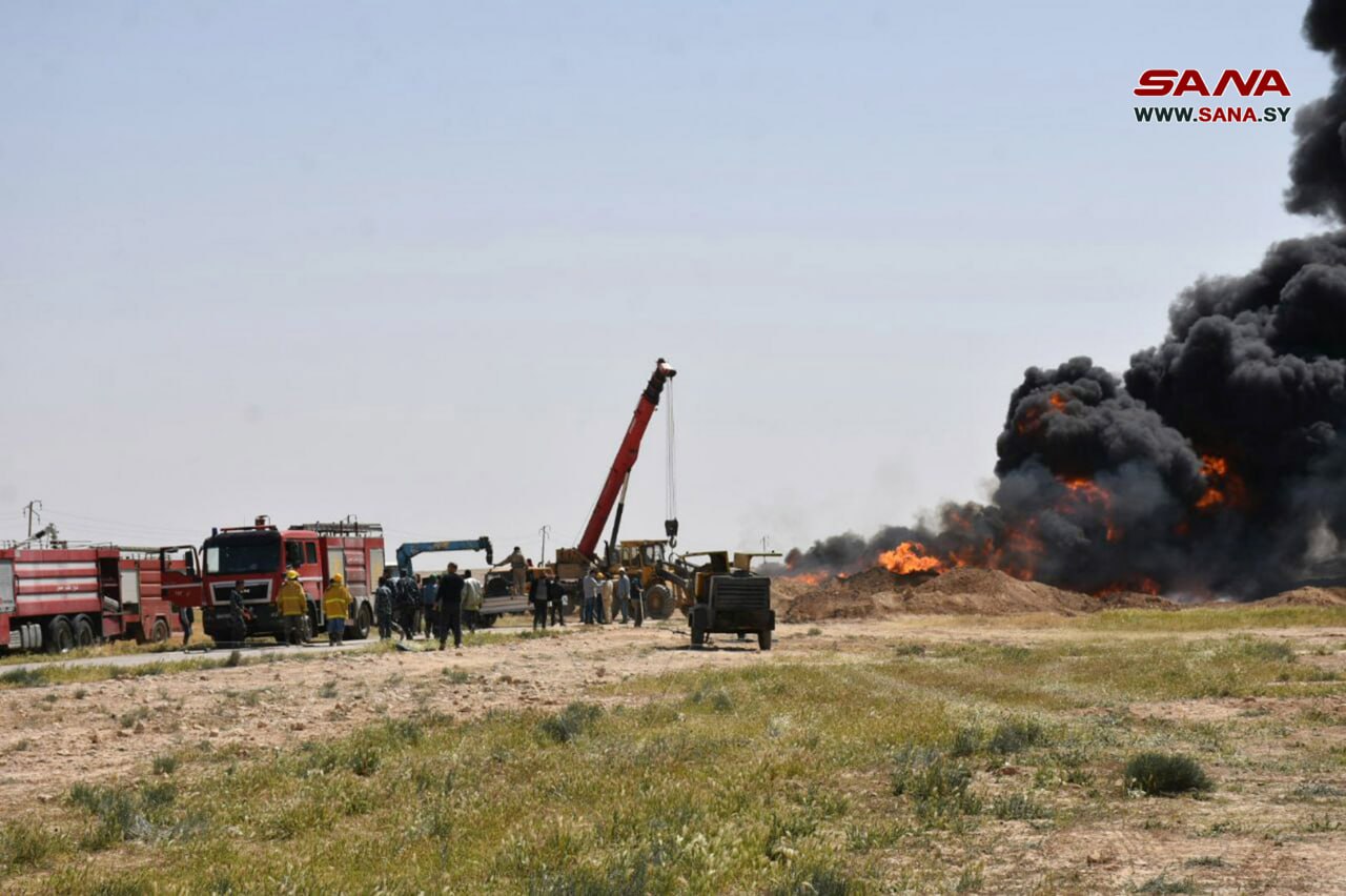 Homs, 21 abr (SANA) Los equipos de bomberos en la provincia central siria de Homs, en colaboración con la Dirección de Defensa Civil, continúan sus labores de extinción del incendio que se produjo en un oleoducto al este de la zona desértica de Al Furqalus.
