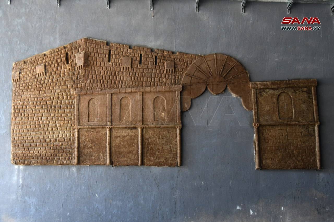 Después de esta frase se puede observar las siete esculturas restantes, que son la fachada de la Mezquita Omeya como uno de los hitos más importantes de Damasco, seguida por la escritura cuneiforme en la tablilla Ugarit de la gobernación de Latakia, luego viene el Arco del Triunfo en Palmira, la Ciudadela de Alepo y Bab Kisan, una de las puertas de la antigua Damasco.