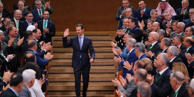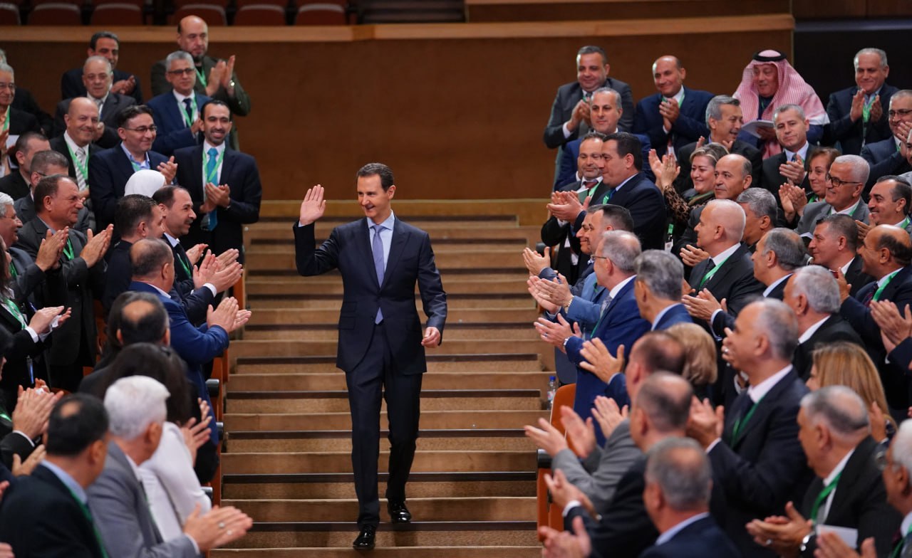 El presidente Al-Assad opinó que, en estas circunstancias en las que el mundo entero es testigo de guerras de naturaleza cultural e ideológica, los partidos ideológicos se vuelven mucho más importantes que antes, y no como se promocionaba hace tres décadas, que la era de las ideologías ha terminado y que la era de los partidos ha llegado a su fin.