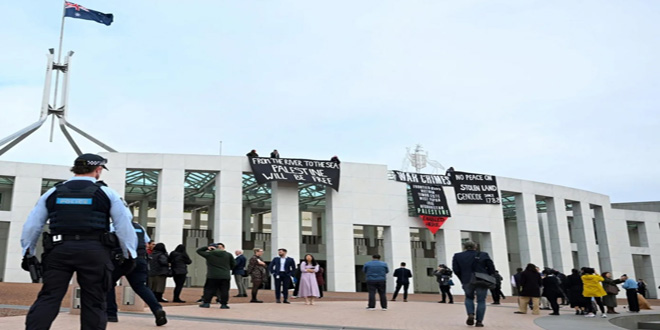 Canberra, 4 jul (SANA) Activistas propalestinos se manifestaron hoy frente al Parlamento australiano en la capital, Canberra, y colocaron pancartas en la sede parlamentaria que exige el fin de la agresión israelí contra la Franja de Gaza.