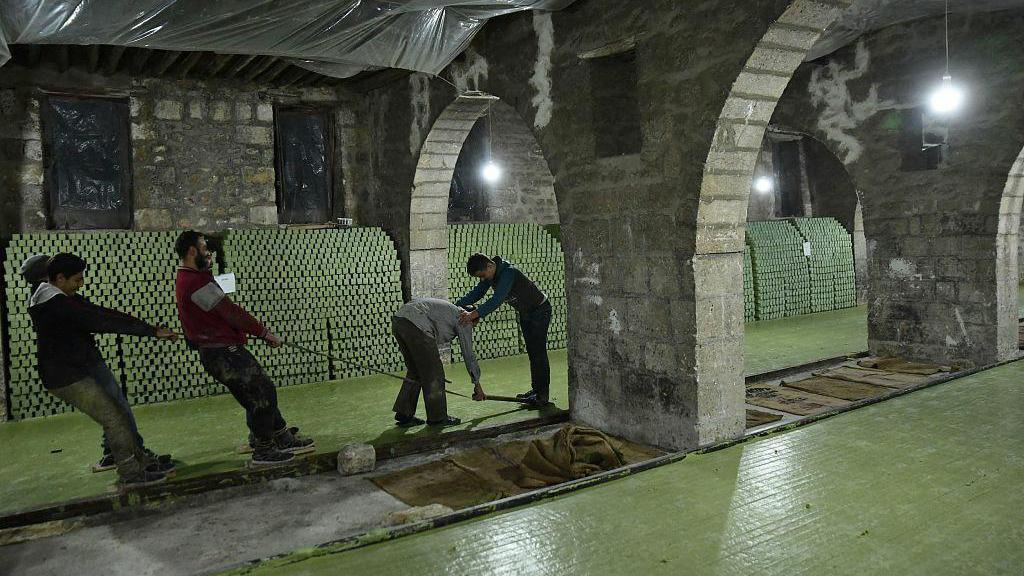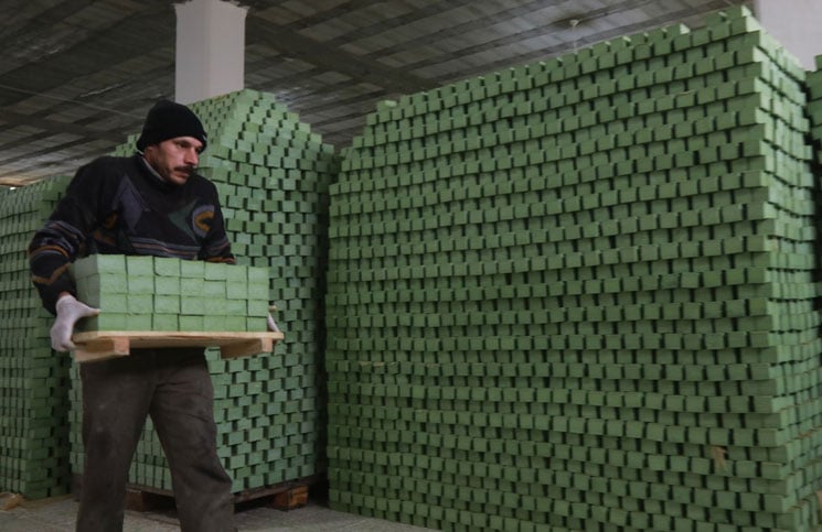 Antes de la guerra, había aproximadamente 150 instalaciones autorizadas para la fabricación de jabón, la mayoría en Alepo y sus alrededores, debido al clima seco y la disponibilidad de aceitunas y mano de obra experimentada.