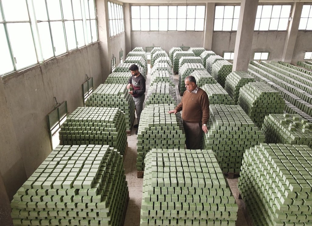 Se deja secar en el lugar por varios días, y entonces comienza la etapa de corte. Los trabajadores ponen las pastillas del producto en forma de una pirámide para que las piezas se sequen más rápido.