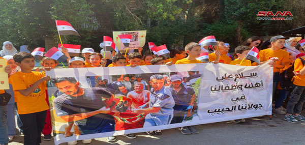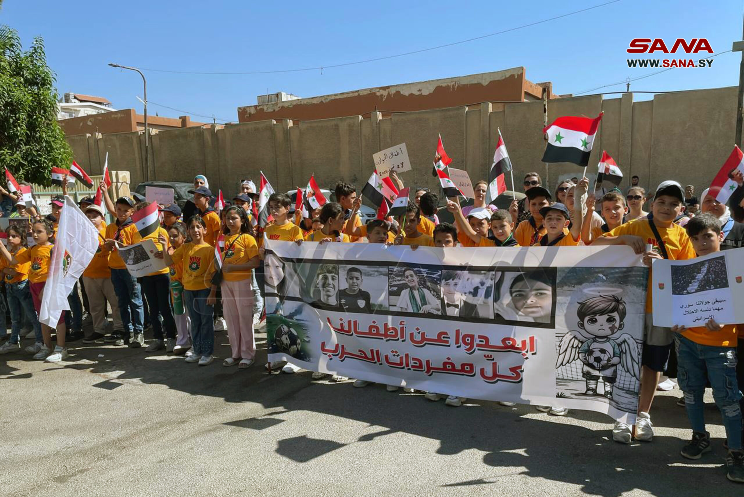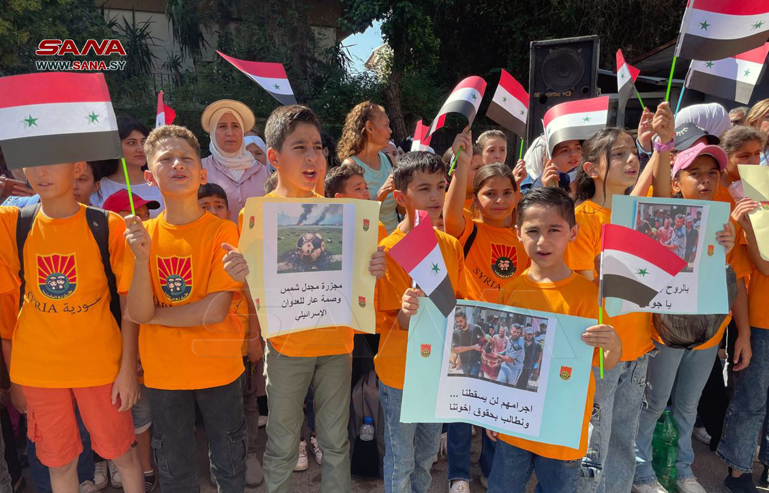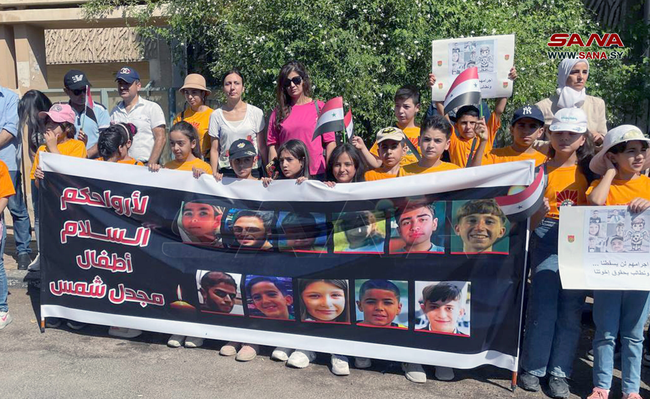 Damasco, 7 ago (SANA) Un grupo de niños sirios se congregó hoy frente a la sede de la Oficina de Naciones Unidas en la capital Damasco para condenar la matanza israelí que causó la muerte de 12 menores que jugaban fútbol en un ataque contra un campo de fútbol en la localidad de Majdal Shams en el Golán sirios ocupado.