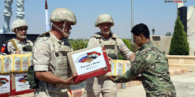 Hama, 17 ago (SANA) Los militares del Centro de Coordinación Ruso con sede en la base de Hemeimim en la provincia costera siria de Latakia, entregaron ayuda alimentaria a varias familias en las ciudades de Mahardeh y Sukelbieh, en la provincia central siria de Hama.