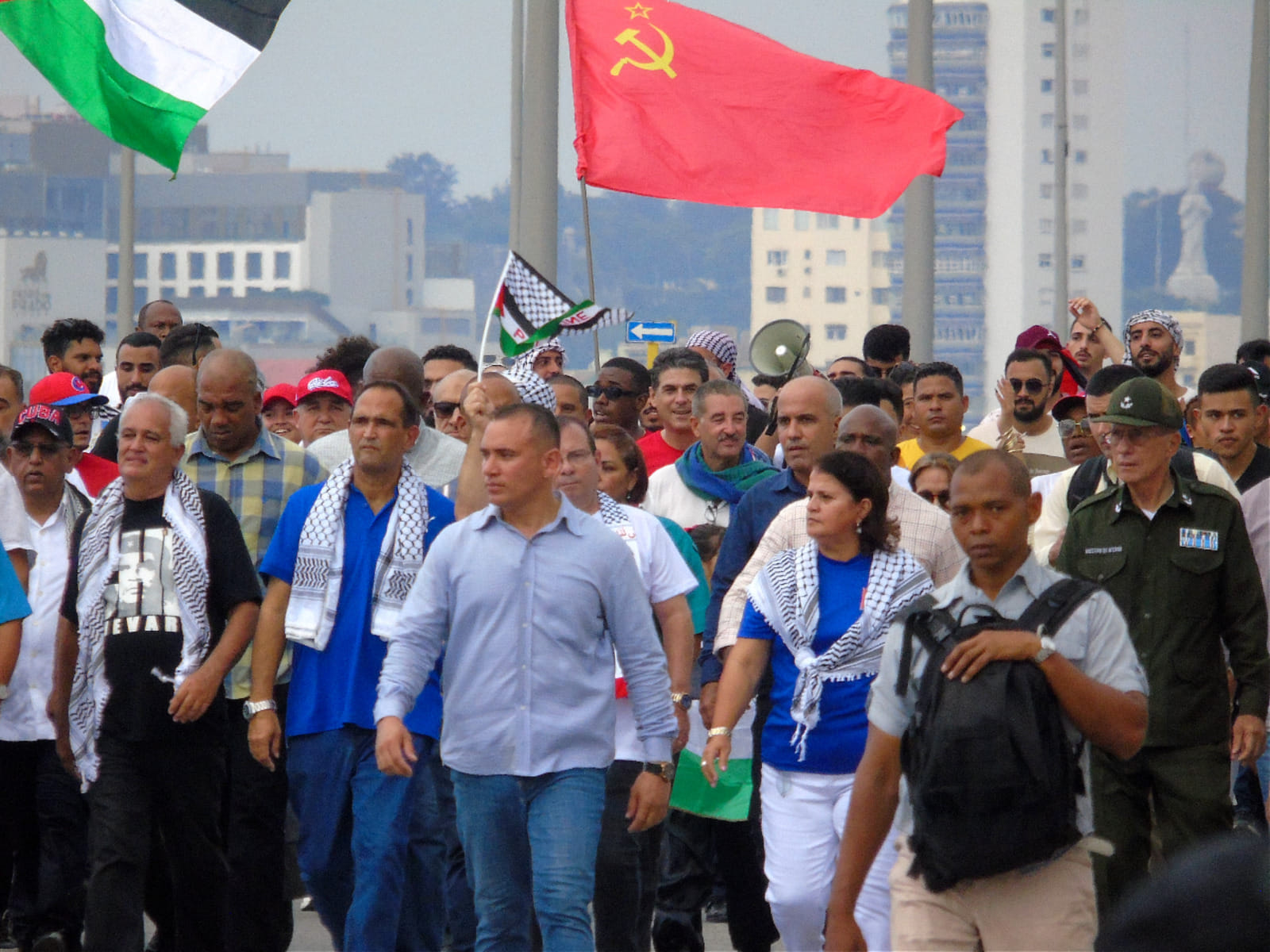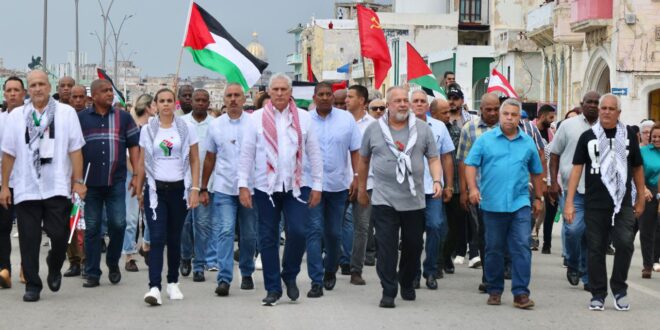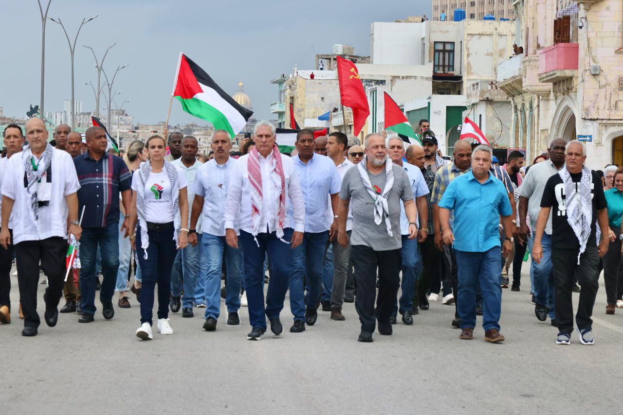 Los participantes en la marcha que encabezada por el presidente cubano Miguel Díaz-Canel y otros altos dirigentes, denunciaron la complicidad de Estados Unidos en la arremetida bélica sionista que cobró la vida de decenas de miles de civiles, gran parte de ellas de mujeres y niños, en Gaza y el Líbano.