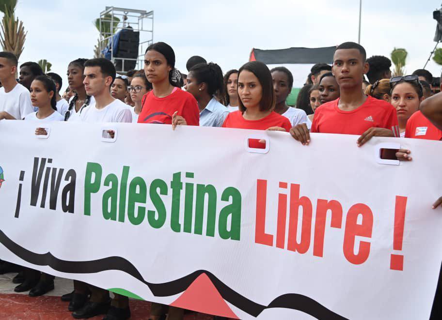 En el acto, la primera secretaria de la Unión de Jóvenes Comunistas de Cuba, Meyvis Estévez, afirmó que esta marcha y las movilizaciones realizadas en todo el país en los últimos días respaldan la posición de esta nación caribeña junto al pueblo palestino, al que calificó de ejemplo impresionante de abnegación y patriotismo.