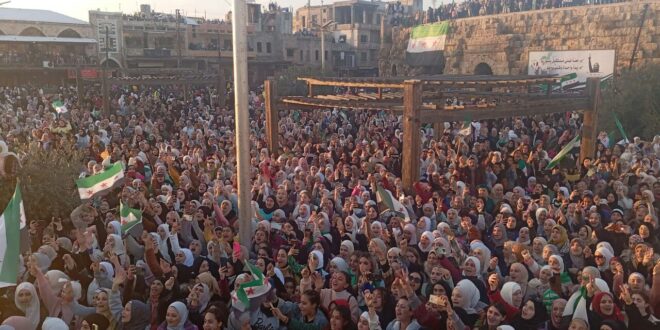 El acto se celebró bajo el lema “Juntos, construimos el futuro de Siria… una sola mano y un solo corazón” y los participantes corearon consignas que instan a la unidad de la nación y del pueblo.