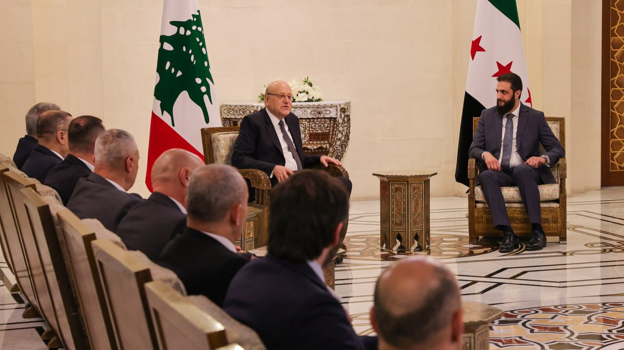 Damasco, 11 ene (SANA) El líder de la nueva administración siria, Ahmed Al-Sharaa, y el ministro de Asuntos Exteriores, Asaad Al-Sheibani, reciben en el Palacio del Pueblo a una delegación libanesa de alto nivel, encabezada por Najib Mikati, el primer ministro del Líbano.