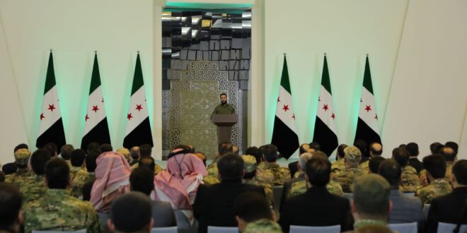 Damasco, 30 ene (SANA) El líder Ahmed Al-Sharaa pronunció unas palabras en la Conferencia de la Victoria de la Revolución Siria, que se celebró en presencia de un gran número de comandantes de las facciones del Departamento de Operaciones Militares y de las fuerzas de la Revolución Siria.