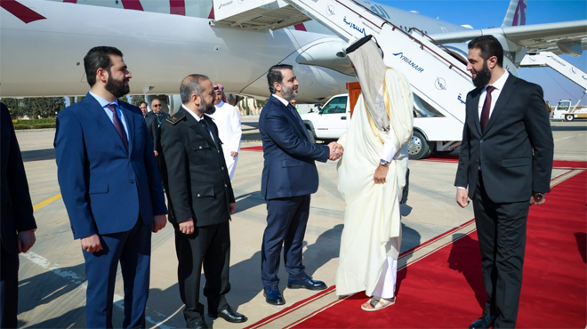 Damasco, 30 ene (SANA) El presidente de la República Árabe Siria, Ahmad Al-Shara, recibió hoy al emir del Estado de Qatar, Su Alteza Tamim bin Hamad Al Thani en el Aeropuerto Internacional de Damasco.