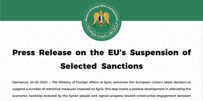 Damasco, 25 feb (SANA) El Ministerio de Asuntos Exteriores y Expatriados de Siria acogió con satisfacción la decisión de la Unión Europea de suspender un conjunto de medidas coercitivas impuestas a Siria y pidió a los socios internacionales que levanten todas las sanciones restantes que obstaculizan la recuperación del país.