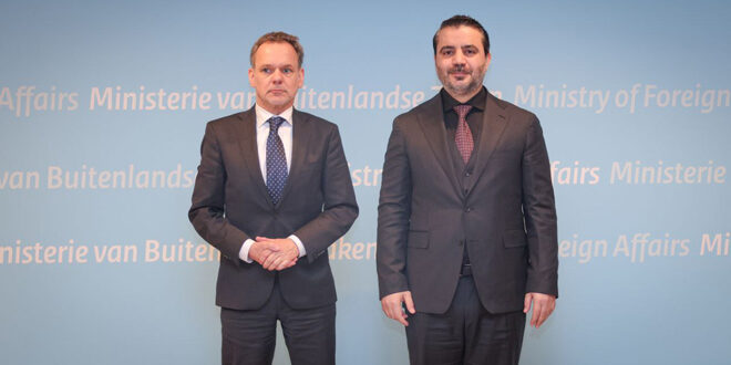 06/03/2025 La Haya, 6 mar (SANA) El ministro sirio de Asuntos Exteriores, Asaad Al-Shaibani, se reúne con su homólogo holandés, Caspar Veldkamp, en La Haya, Países Bajos. 2025-03-06 fady