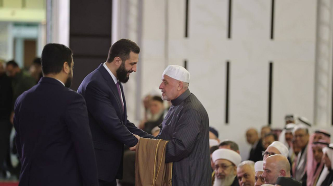 En la oración se unieron al Presidente el ministro de Asuntos Exteriores, Asaad Al-Shaibani, el ministro de Defensa, Murhaf Abu Qasra, el ministro de Justicia, Mazhar Al-Wais, el gran mufti Osama Al-Rifai, varios funcionarios estatales, comandantes del Ejército Árabe Sirio, figuras prominentes y activistas de la comunidad siria.