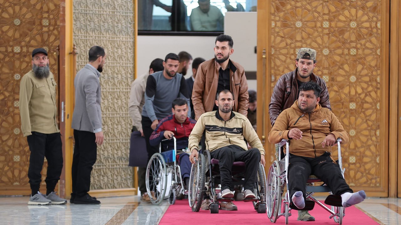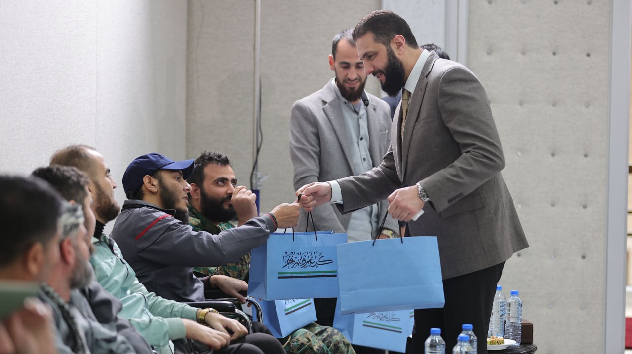 02/04/2025 El presidente Ahmad Al-Shara recibe en el Palacio del Pueblo de Damasco, a los heridos en las batallas de liberación, y los felicita por Eid Al-Fitr. 2025-04-02 fady
