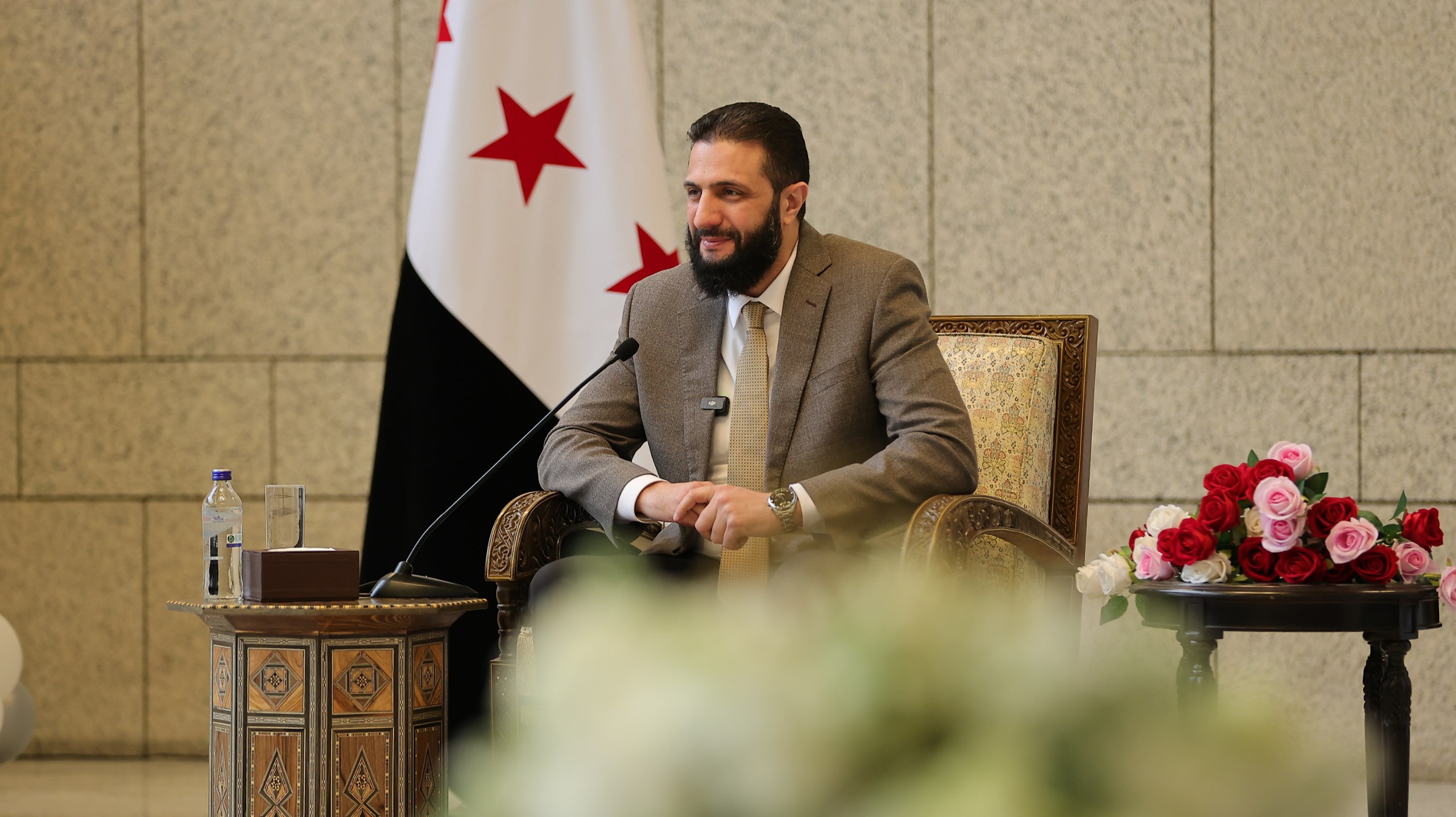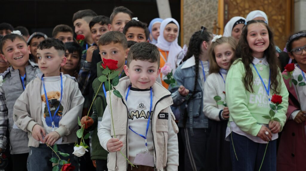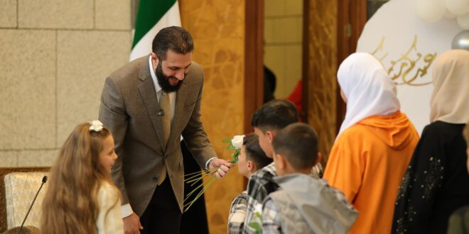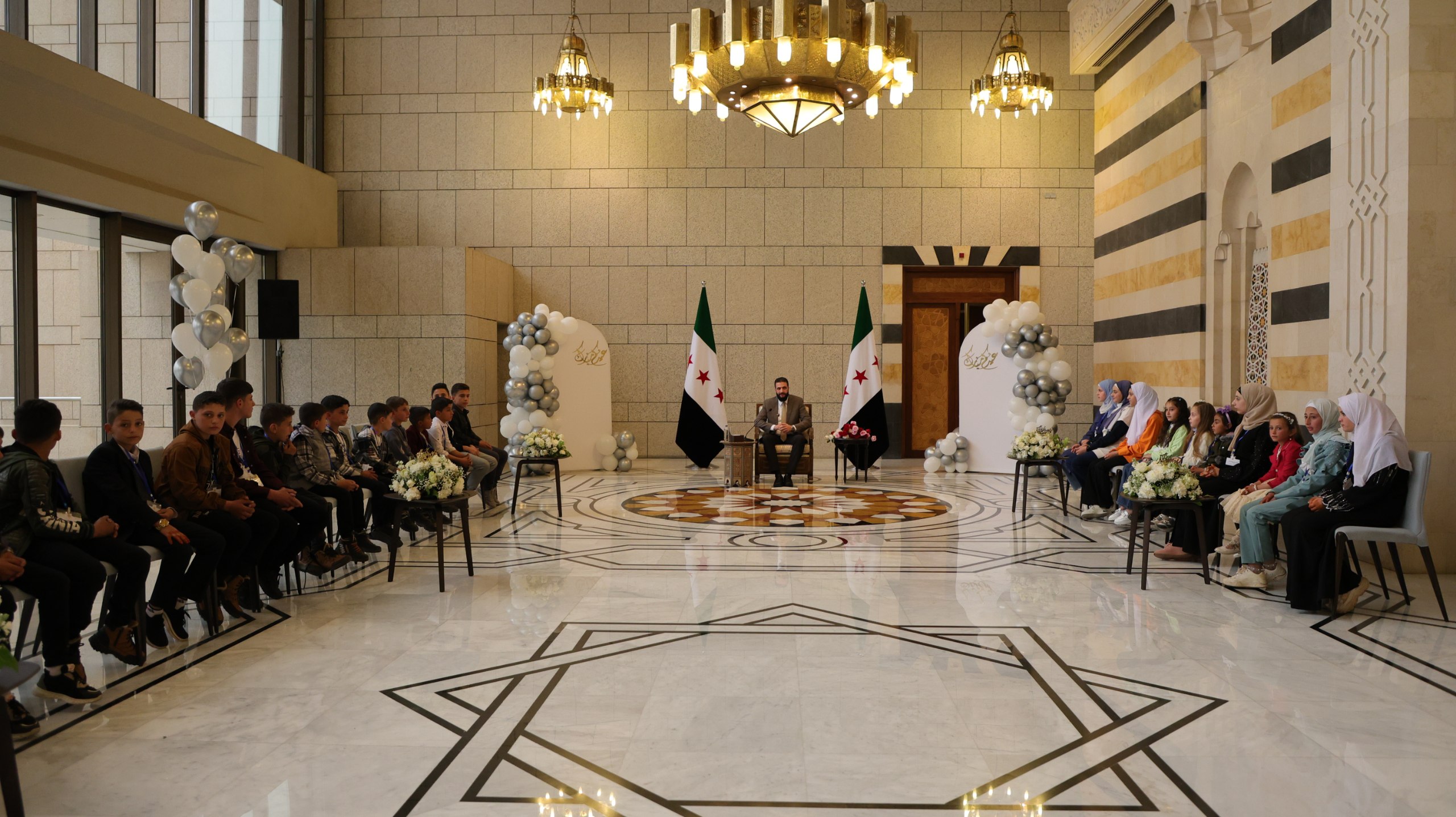 Damasco, 2 abr (SANA) El presidente Ahmad Al-Shara recibió esta tade en el Palacio del Pueblo de Damasco a un grupo de niños desplazados que viven en campamentos, y los felicitó por Eid Al-Fitr (la fiesta que marca el fin del sagrado mes de ayuno de Ramdán).
