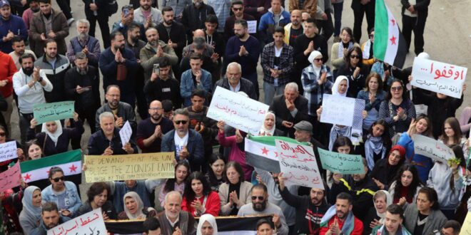 Hama, 4 abr (SANA) La ciudad de Masyaf al oeste de la provincia de Hama en el centro del país, fue testigo de una protesta contra las agresiones israelíes contra territorio sirio.