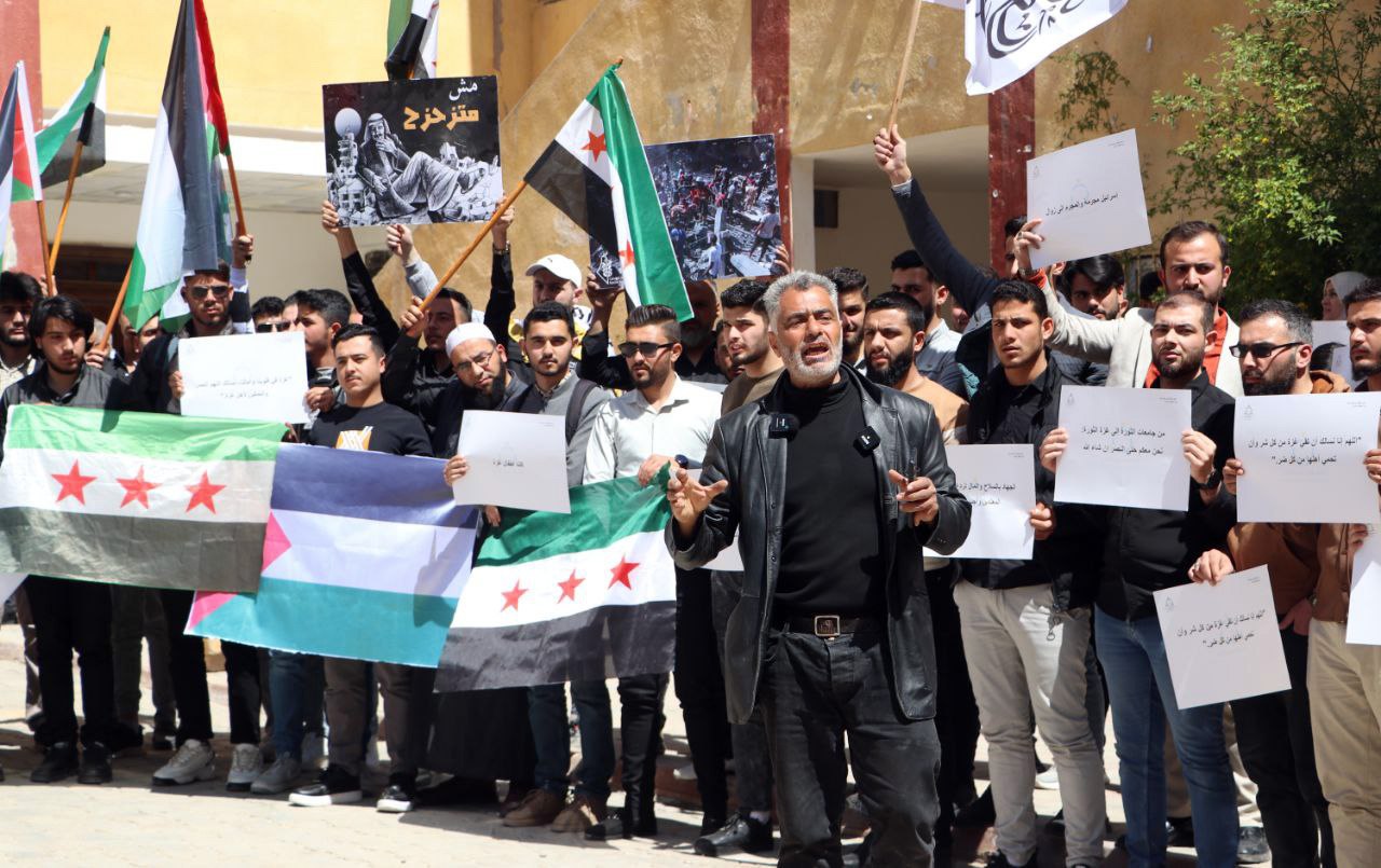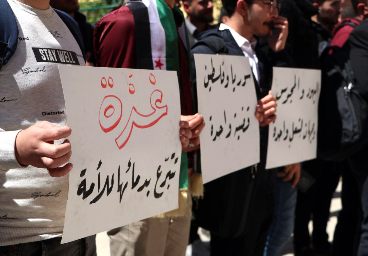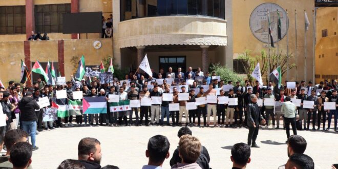 Alepo, 7 abr (SANA) Los estudiantes de la Universidad Libre de Alepo organizaron hoy una manifestación solidaria con el pueblo de Gaza en la ciudad de Azaz, en el norte de Alepo.