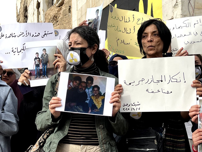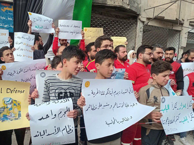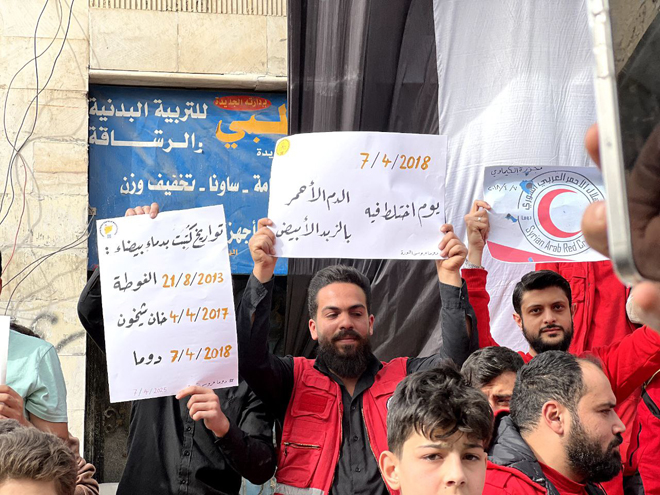 Durante una vigilia celebrada en la Plaza de los Mártires de Duma, cerca del centro médico que fue blanco del bombardeos con bombas químicas, los participantes levantaron carteles que exigien el procesamiento del presidente del antiguo régimen.