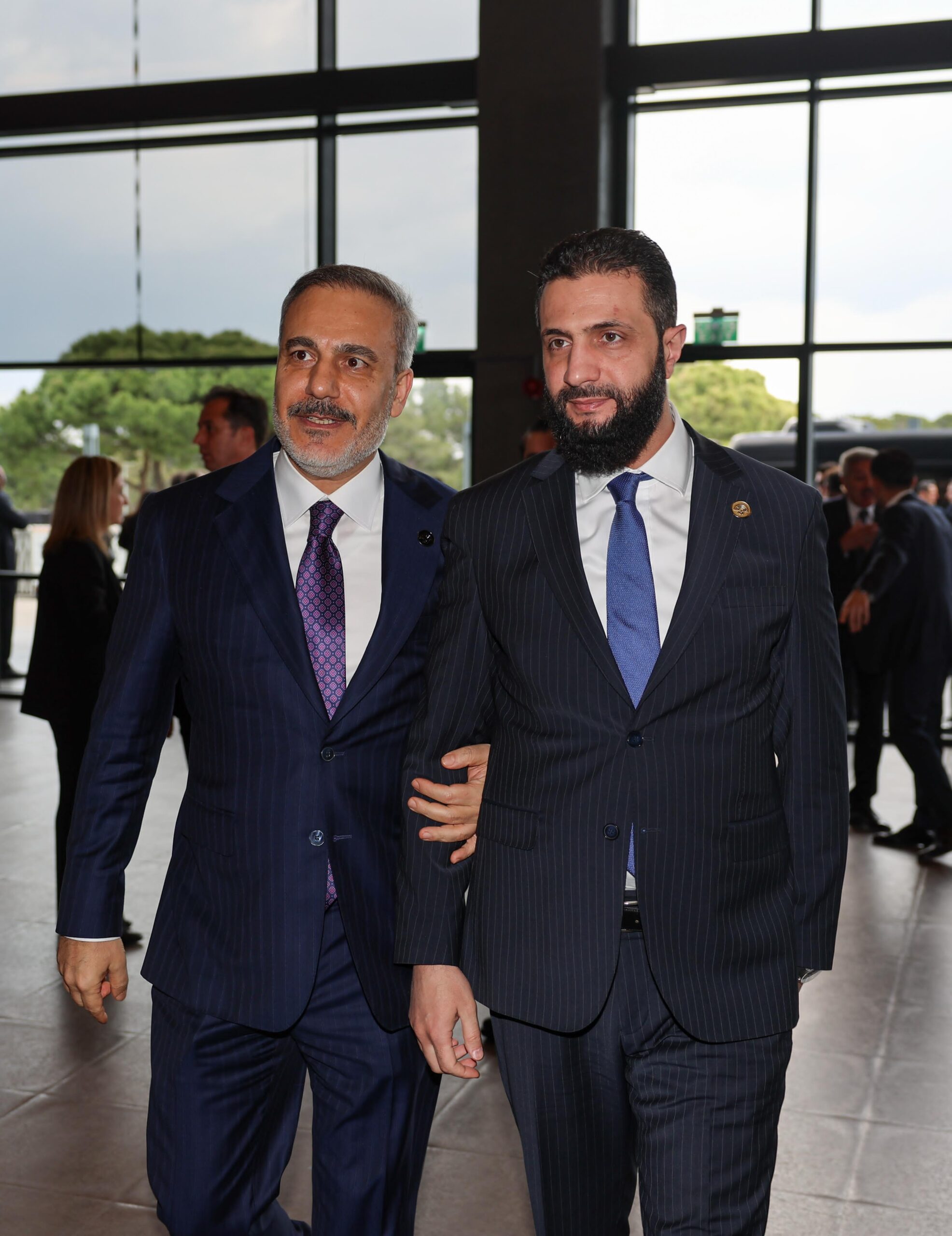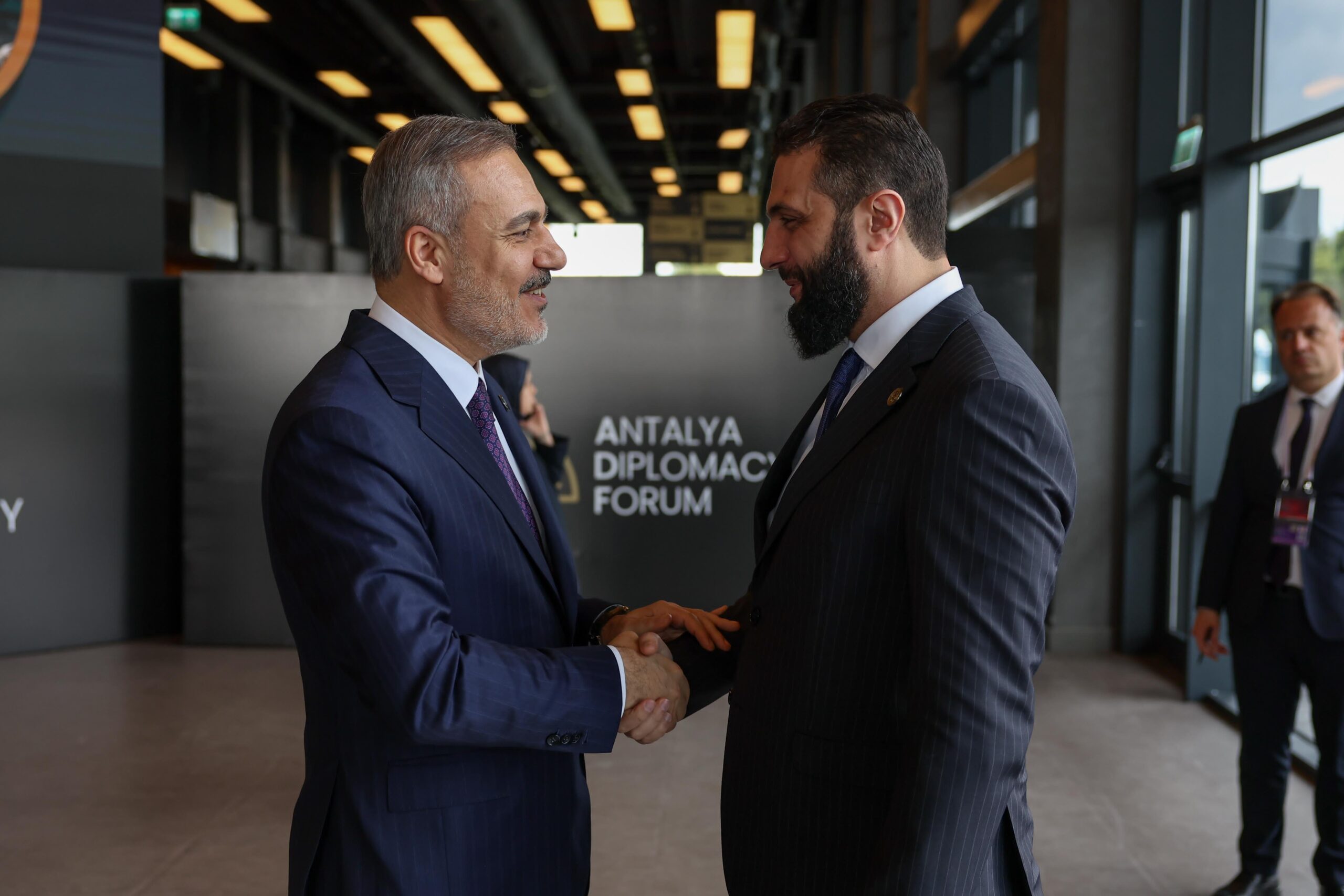ANTALYA, TURKIYE – APRIL 11: Turkish Foreign Minister Hakan Fidan (L) and Syrian President Ahmed al-Shara (R) attend opening ceremony of the 4th edition of the Antalya Diplomacy Forum (ADF2025) in Antalya, Turkiye on April 11, 2025. The 4th edition of the Antalya Diplomacy Forum (ADF2025), hosted by the Ministry of Foreign Affairs of the Republic of Turkiye, under the auspices of Turkish President Recep Tayyip Erdogan, will take place on 11-13 April 2025, in Antalya, Turkiye. This year’s theme “Reclaiming Diplomacy in a Fragmented World” reflects the pressing need for diplomacy to reassert itself as a stabilizing force, amid rising global divisions. ( Arda Küçükkaya – Anadolu Agency )