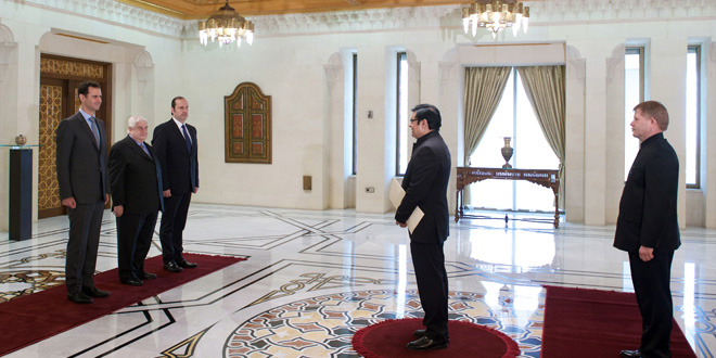 El presidente Bashar Al-Assad ha recibido hoy las cartas credenciales del Embajador de cuba Rogerio Manuel Santana Rodríguez, del Embajador de La India Man Mohan Bhanot, y del Embajador de Pakistán Syed Athar Hussain Bukhari.