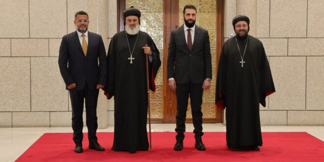 Damasco, 30 abr (SANA) El presidente sirio Ahmad Al-Shara recibe a una delegación de la Iglesia Ortodoxa Siria, encabezada por el patriarca Ignacio Aphrem II.