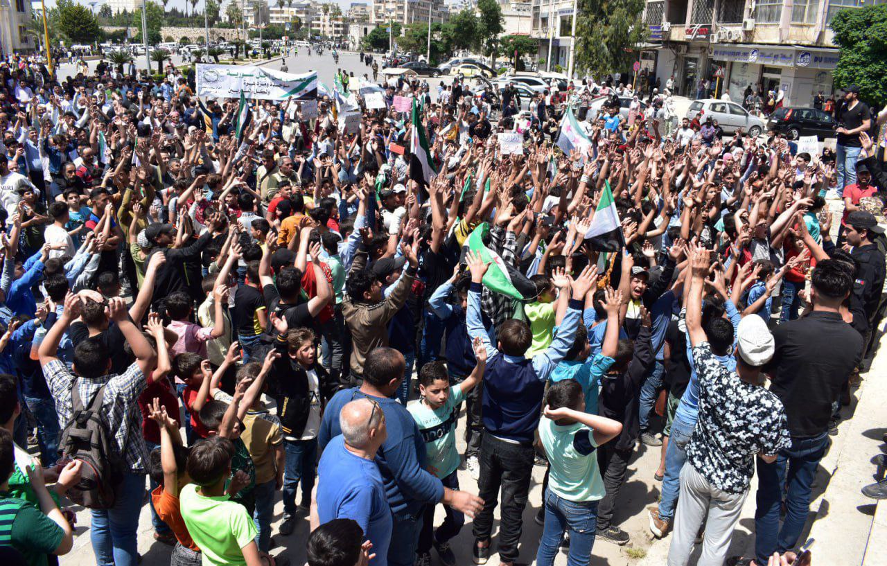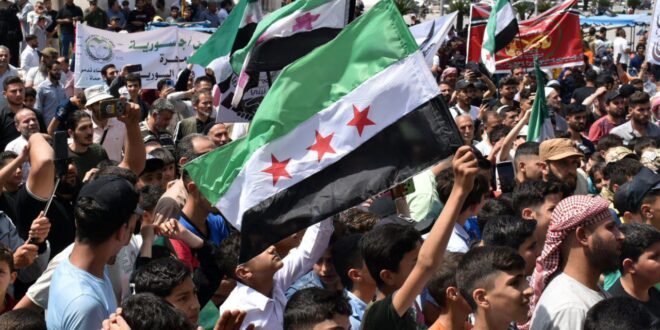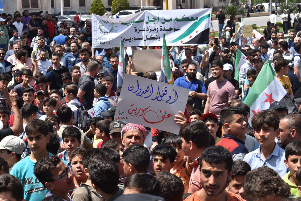 Los manifestantes levantaron banderas nacionales y pancartas que reafirman la unidad y soberanía de Siria.