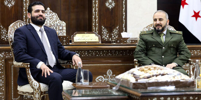 Damasco, 7 may (SANA) El ministro de Defensa, Marhaf Abu Qasra y del Interior, Anas Khattab, discutieron los mecanismos de trabajo conjunto entre los dos ministerios, con el fin de mejorar la seguridad y la paz civil, y lograr los más altos niveles de cooperación y coordinación.