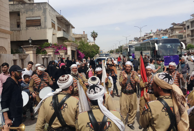 Homs, 08 may (SANA) Como parte de los esfuerzos en curso para garantizar el retorno seguro y digno de las personas desplazadas, la ciudad de Homs recibió hoy dos convoyes que transportaban personas desplazadas, por la fuerza a manos del régimen anterior,.