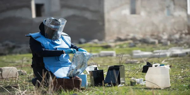 Idlib, 19 may (SANA) En la aldea de Abbad al norte de Alepo, se prepara Lama Haj Qaddour para desactivar una bomba de racimo encontrada en un campo agrícola. Esta labor se ha vuelto parte inseparable de su vida cotidiana.