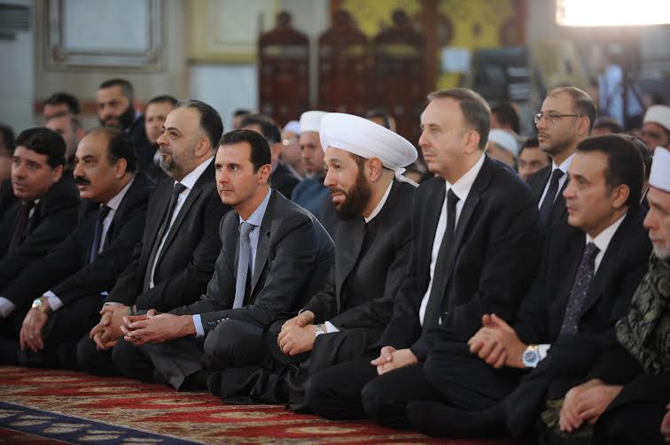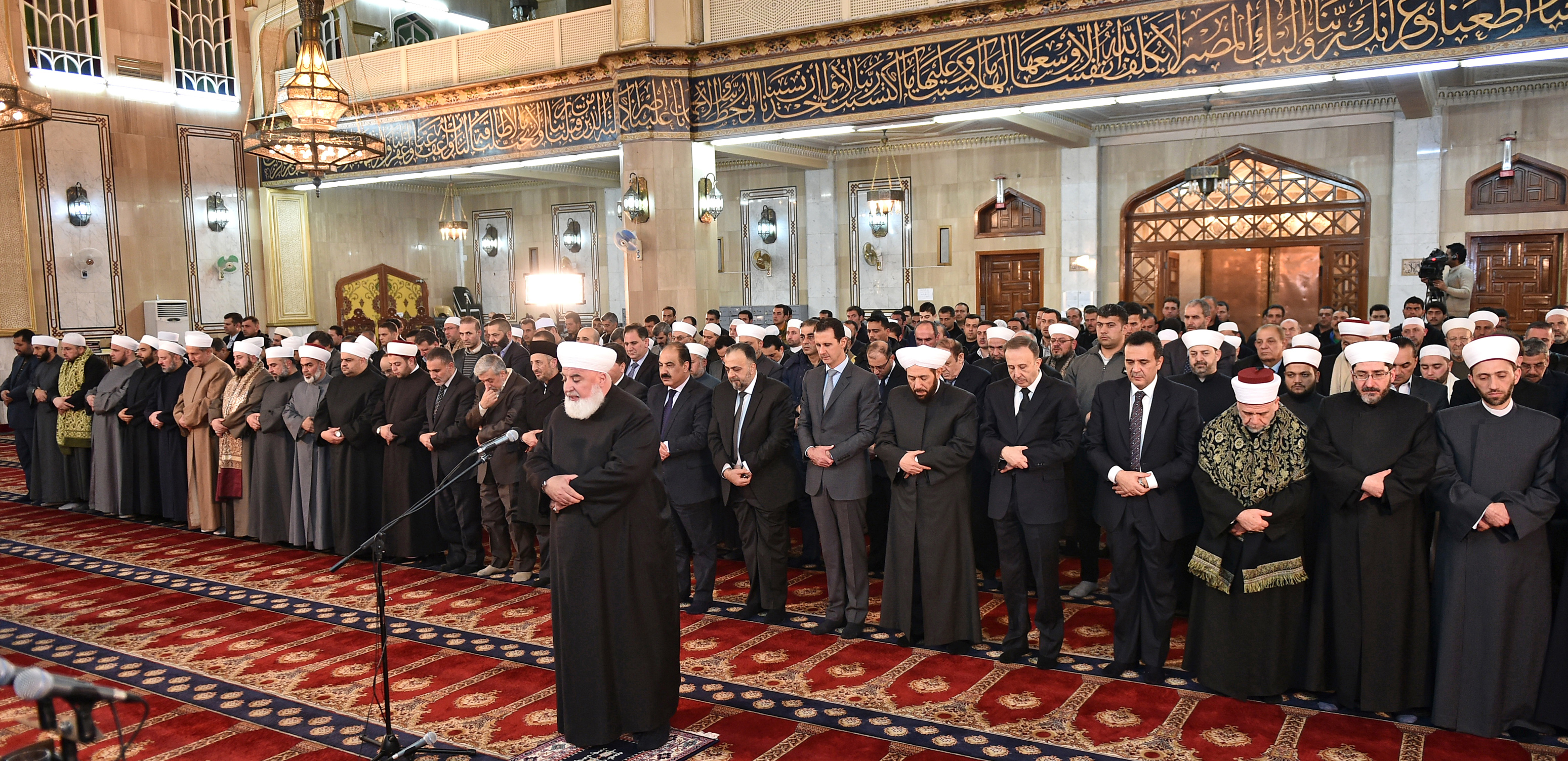 Luego de estrecharle la mano a las personalidades que estaban a su recibimiento, el Presidente Al-Assad practicó en la mezquita al-Akram el rezo del anochecer con el imam Adnan al-Afeoni, el gran muftí de Damasco.