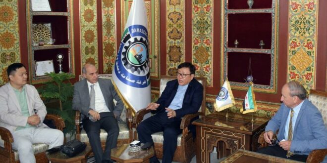 Damasco, 5 jun (SANA) El director de la Cámara de Industria de Damasco, Mohammad Ayman al-Mawlawi, conversó con Zhu Lijan y Sun Shibin, miembros de la junta directiva de la Fundación de Amistad Sirio-China, sobre los planes futuros para la labor de la parte china en las zonas francas de Adra, cerca de Damasco, y de Hasseha, en la provincia de Homs.