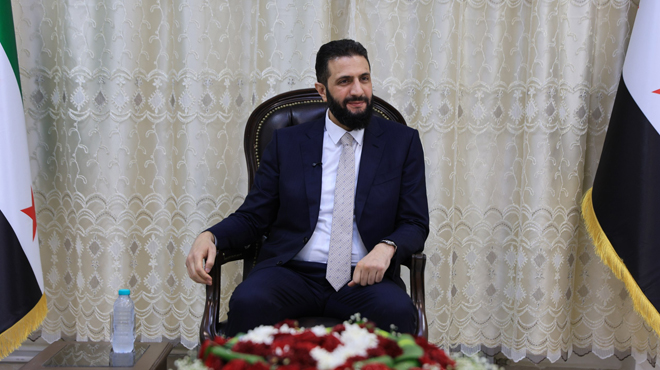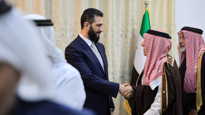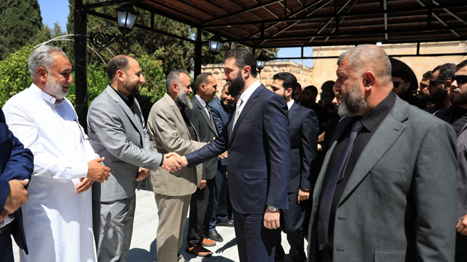07/06/2025 Deraa, 7 jun (SANA) Presidente Al-Shara recibe a los miembros de la Autoridad de Conciliación en la provincia de Deraa 2025-06-07 Esraa