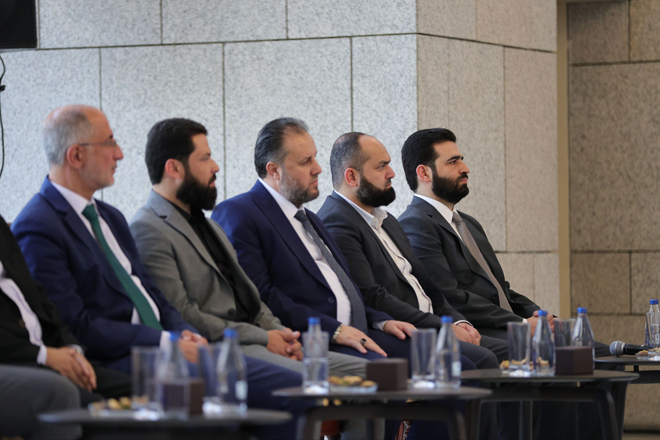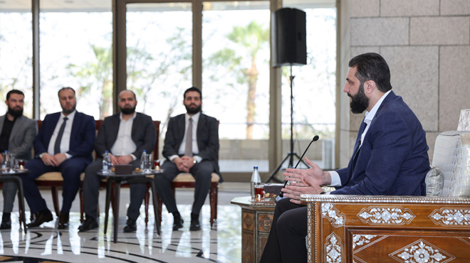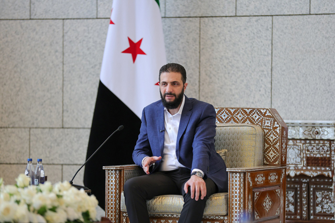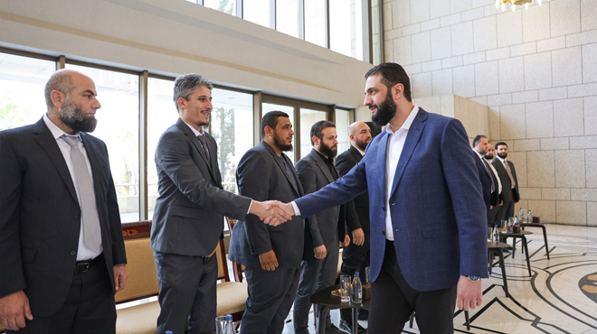 Damasco, 10 jun (SANA) Con motivo del Eid Al-Adha, el presidente Ahmed Al-Shara recibió al ministro del Interior, Anas Khattab, y a varios funcionarios ministeriales.