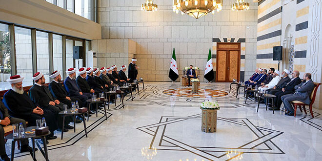 Damasco, 5 jul (SANA) El presidente Ahmad Al-Shara recibió este sábado en el Palacio del Pueblo de Damasco, a una delegación de Dar al-Fatwa de la República Libanesa.