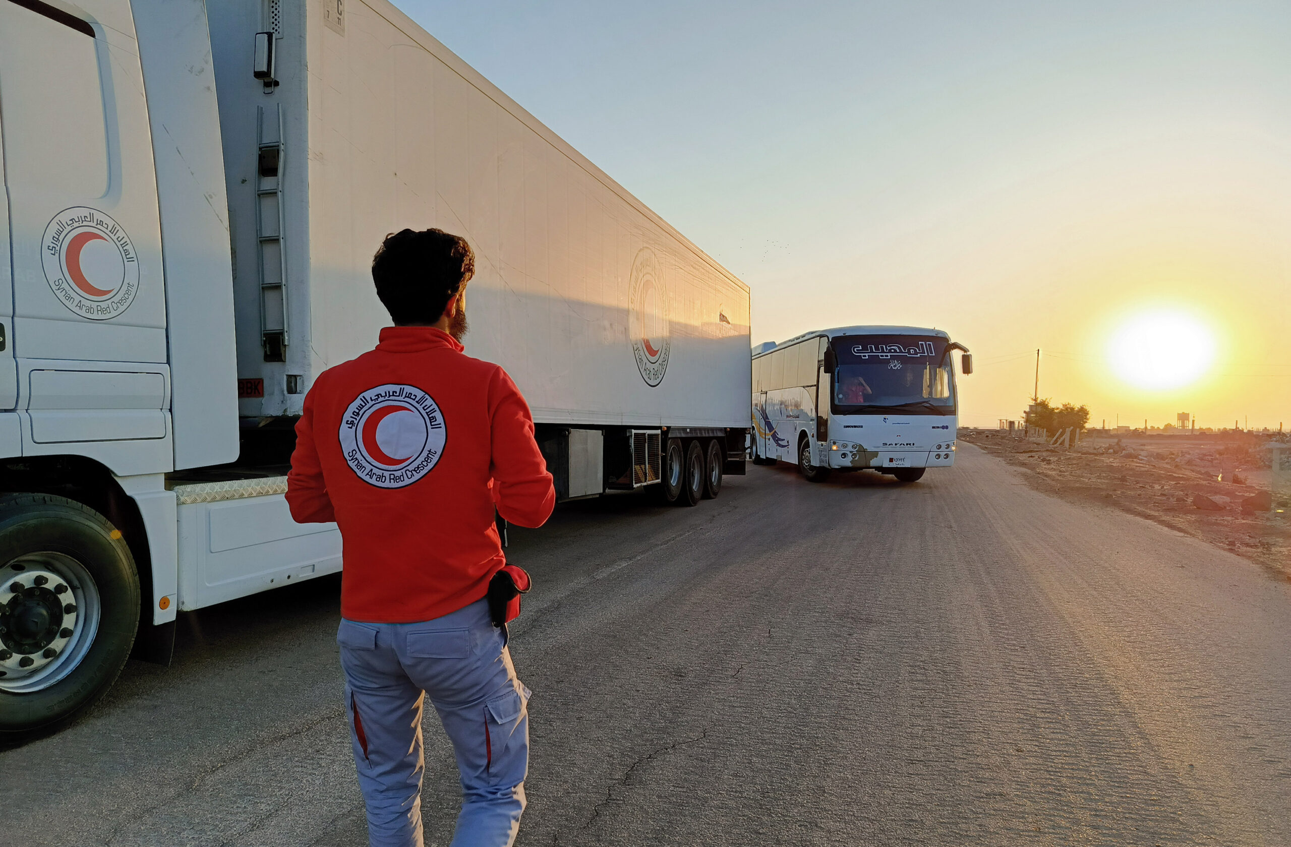 El convoy incluye un camión refrigerado con alimentos y suministros médicos, así como cuatro autobuses destinados a trasladar a 250 personas desde Sweida hacia Deraa.