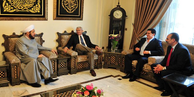 Damasco, SANA– El senador estadounidense Richard Black, realizó el martes una visita al Gran Muftí de la República Dr. Ahmad Badr al-Din Hassoun, durante una reunión con el Gran Muftí, Black afirmó que él trabajará para transmitir la realidad de lo que está sucediendo en Siria y tratará de cambiar la opinión pública en su país hacia los acontecimientos en Siria y de convencer el Congreso de Estados Unidos para reabrir la embajada norteamericana en Siria, haciendo hincapié en que la firme resistencia del pueblo sirio ante el terrorismo sorprendió a todo el mundo.