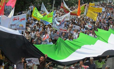 Teherán, SANA– Los participantes en las marchas por el Día de Jerusalén en Teherán y en 850 ciudades iranís reconfirmaron el apoyar del pueblo iraní a Siria, Irak, y sus ejércitos y todas las fuerzas de resistencia en su guerra contra el terrorismo takfiri.