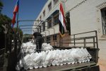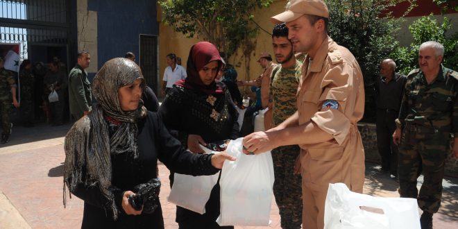 Se distribuyeron este sábado ayudas humanitarias ofrecidas por Rusia a los desplazados que se encuentran en la zona de Shaam al-Maarafe ubicada en la localidad de Sahnaya en la provincia de Damasco-campo.