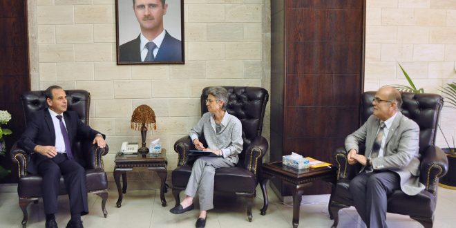 El ministro de Salud, Dr. Nizar Yazayi, abordó este miércoles con la jefa del Comité Internacional de la Cruz Roja en Siria, Marianne Ghasser, la cooperación bilateral en materia de responder a las necesidades del sector de salud en Alepo, a la luz de los continuos ataques terroristas en su contra.
