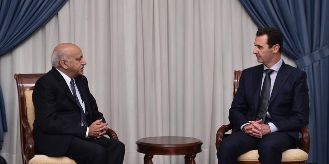 Damasco, SANA– El presidente Bashar Al-Assad ha recibido este sábado al ministro de Estado para Asuntos Exteriores de India, Mubashir Javed Akbar, y a la delegación que le acompaña.