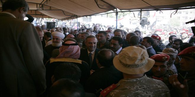 El Gobernador, acompañado por destacadas figuras religiosas, políticas y militares junto con diputados de la Asamblea del Pueblo sirio, pronunció una palabra ante una concentración de residentes de al-Moadamiya, en la cual explicó que su visita tiene por objetivo hacer una evaluación de los daños que sufrieron la infraestructura, las instalaciones públicas y los bienes privados a manos de los terroristas, y luego elaborar planes inmediatos para reparar estos daños y reponer en funcionamiento a los establecimientos estatales en la ciudad.
