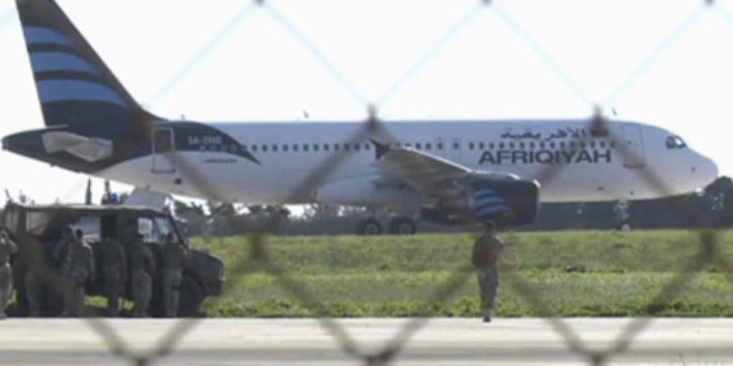 El avión, un Airbus 320 de la compañía libia Afriqiyah Airways y con 111 pasajeros y siete miembros de la tripulación, aterrizó esta mañana a las 11:32 hora local en el aeropuerto de la Laguna. La autoridad aeroportuaria maltesa MIA confirmó la «interferencia ilegal» en el aeropuerto. Los vuelos salientes o con destino al aeropuerto maltés han sido desviados o cancelados, mientras los primeros equipos de respuesta de emergencia se personan en el aeródromo.
