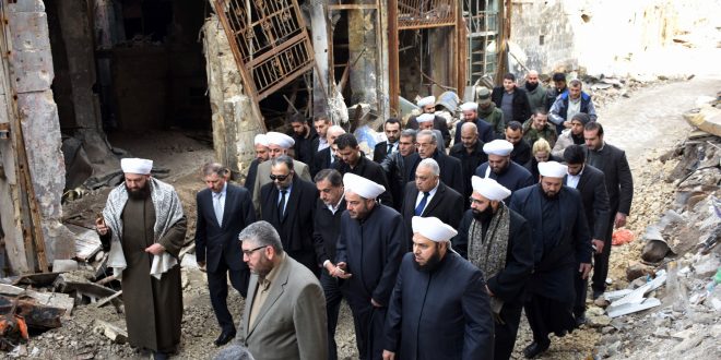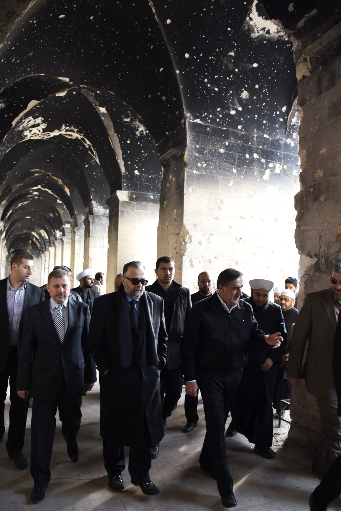 A continuación, el ministro acompañado por el Gobernador de Alepo realizó un recorrido en la ciudad antigua de Alepo, e inspeccionó la destrucción causada por los terroristas en la Gran Mezquita de los Omeyas, la Ciudadela, la mezquita de al-Khasrayuieh, la iglesia evangélica árabe, y la iglesia maronita.