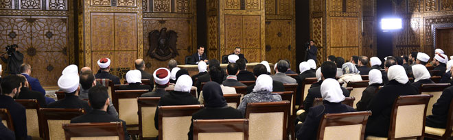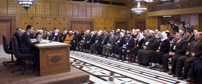 Durante el encuentro, el presidente al-Assad elogió la labor llevada a cabo por el grupo, considerando que el mismo refleja una imagen civilizada de la moderación en la religión islámica, señalando que algunos de los más importantes asuntos que deben ser desarrollados por el grupo son la reformulación de la terminología y la corrección de los conceptos falsos con la intención de propagar la religión correcta frente al extremismo.