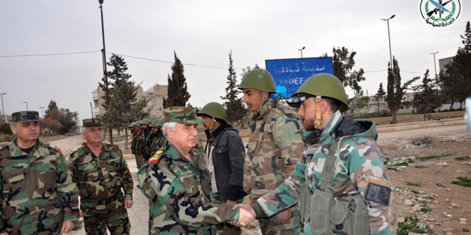 El jefe del Estado Mayor visitó la ciudad de Tadef, la colina Abu Taltal y un número de pueblos liberadas en el campo noreste de la ciudad de Alepo, donde se informó sobre la magnitud de la devastación y la destrucción causada por los terroristas del “Daesh” y sus métodos terroristas y criminales en minar los vehículos blindados que se les proporcionaron los países patrocinadores del terrorismo.