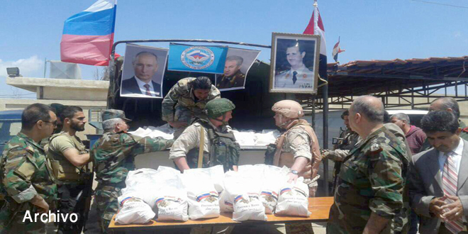 Unas 300 raciones alimentarias presentadas por Rusia se distribuyeron en la provincia de Quneitra a los familiares de los mártires, los heridos, los inmigrantes, y los necesitados en la localidad de Kom Mheires en la comarca este de la provincia.