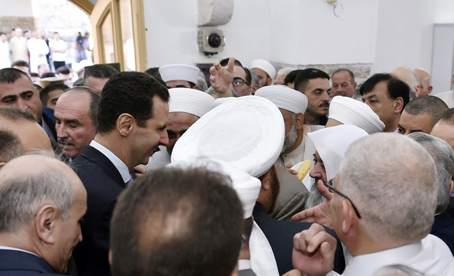 Junto al presidente efectuaron el rezo el ministro de Asuntos Religiosos (Auqaf), Muhammad Abdul-Sattar al-Sayed y el muftí general de la República Dr. Ahmad Badreddin Hassún y el gobernadoe de Hama y el secretario del Comité provincial del Partido en Hama, además de algunos miembros de la Asamblea del Pueblo y un conglomerado de ulemas “eruditos” de la religión islámica y un público de ciudadanos, quienes rezaron todos conducidos por el clérigo Dr. Naym Eddín al-Alí director de Auqaf de Hama.