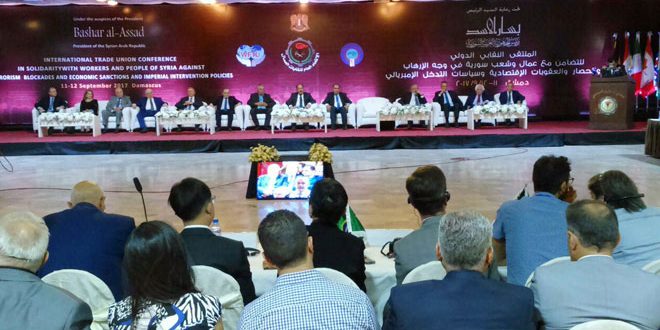 En un discurso pronunciado en la apertura del Foro, el presidente de la Federación General de Sindicatos de Trabajadores en Siria, Jamal Kadri, dijo que el pueblo sirio se enfrenta a un terrorismo sucio apoyado por fuerzas externas, y también resiste a una guerra económica cuyos autores la haan declarado en sintonía clara con los actos de sabotaje de los terroristas contra las instalaciones económicas y de infraestructura.
